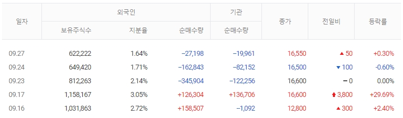 한편 외국인과 기관은 이 종목에 대해서 각각 최근 3일, 3일 연속 팔자 행진을 벌이고 있습니다. 더욱이 전일 외국인이 대량 순매도를 하고 있어 투자자들의 관심이 집중되고 있습니다.