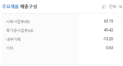동사의 주요제품 매출 구성비율은 사료사업부 63.15%, 육가공사업부 49.42%, 내부거래 -13.20%로 구성되어 있습니다. 전체매출의 63%가량을 사료사업부가 차지하고 있습니다.
