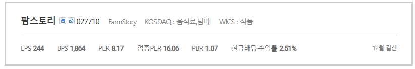 팜스토리의 PER(주가수익비율)은 8.82, ROE(자기자본이익률)는 14.74 수준입니다. 팜스토리 시가총액은 2,663억 원이고 시가총액 순위는 코스닥 394위입니다. 상장주식수는 111,416,600이며 액면가는 1주당 500원입니다.