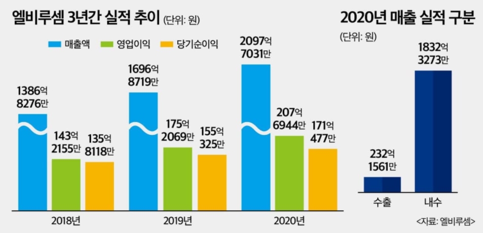 엘비루셈의 지난해 매출액은 2098억원이었으며, 영업이익은 208억원이었습니다. 당기순이익은 171억원이었습니다. 현재 자본금은 128억원입니다.