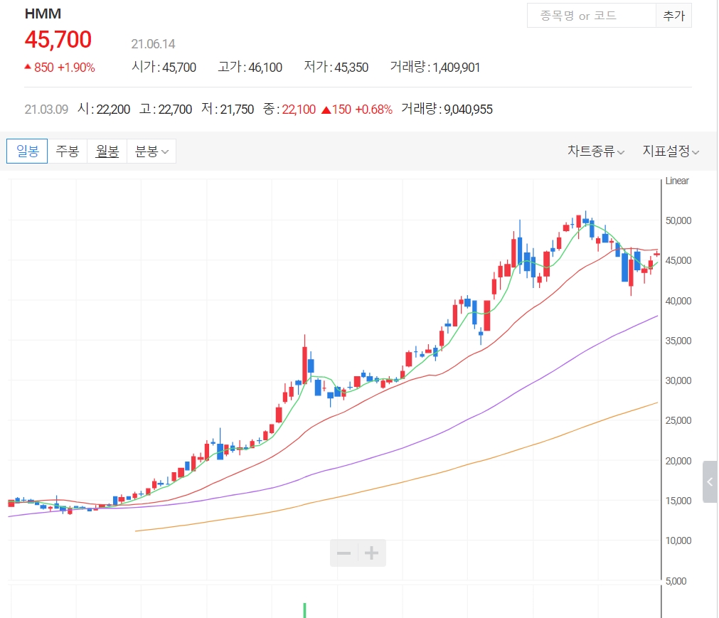 실제 증권 업계에서는 HMM은 2분기에도 1조 원이 넘는 영업이익을 거둘 것으로 내다보고 있으며 강세는 당분간 이어질 것으로 보고 있습니다. 올해HMM 및 해운업에는 긍정적인 전망을 보고 있으며 HMM은 지난달 초대형 컨테이너선 6호를 인수, 당월 추가 컨테이너선 인수로 인하여 선복량, 적재능력 확대로 인한 실적 증가 또한 기대되고 있습니다.