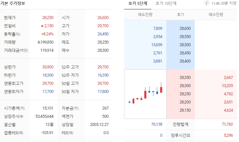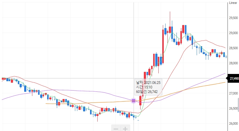 차바이오텍은 27,000원으로 개장해서 장중 한때 26,450원(-2.04%)까지 소폭 밀렸다가 다시 28,400원(+5.19%)까지 상승 반전한 후 현재 9%까지 상승한 상태입니다. 차트상 주가의 흐름은 현재 단기·중기 이평선이 정배열 상태로 상승세를 보이고 있습니다.