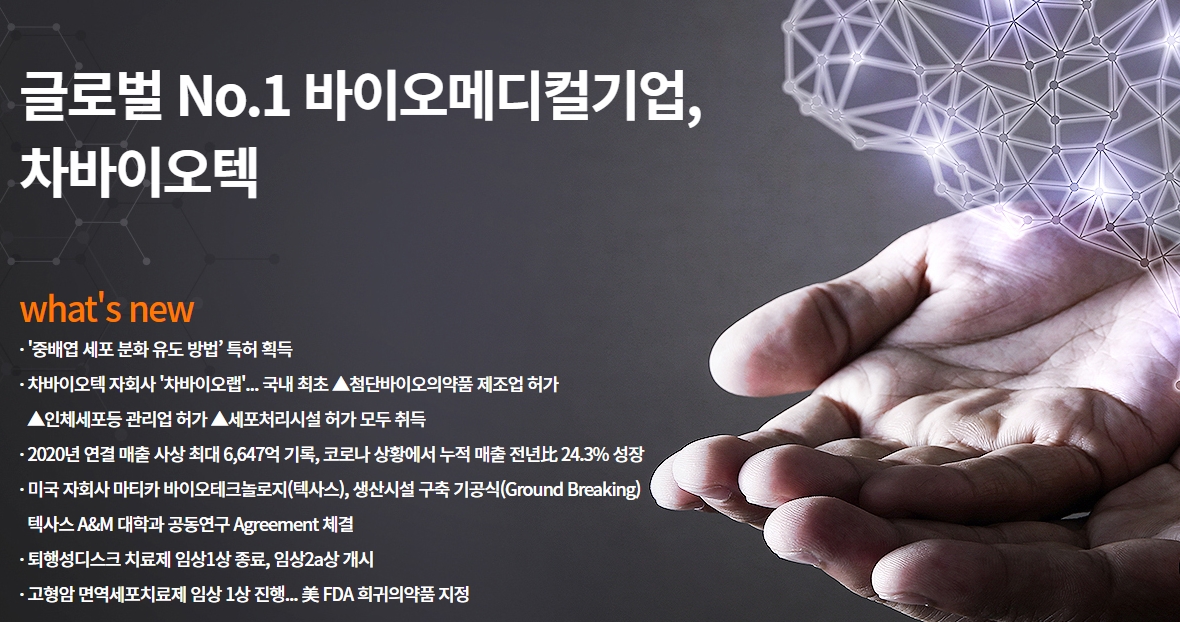 차바이오텍은 2002년 11월 6일에 설립된 후, 2005년 12월에 코스닥 시장에 상장됐습니다. 세포치료제 개발, 줄기세포 연구 및 안티에이징 관련 서비스 용역 등을 주력 사업을 영위하고 있습니다. 호주 및 미국 소재의 City Fertiliy Clayton Pty, Matica Biotechnology. 기업 외에 다수의 종속기업을 보유하고 있습니다.