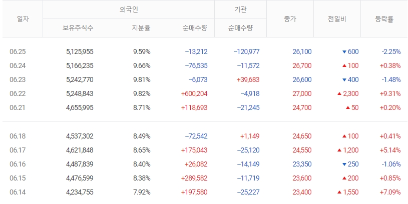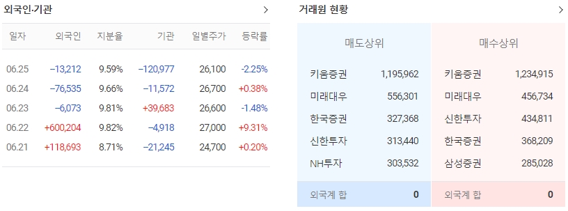 지난 한달을 기준으로 보면 외국인이 155.9만주를 순매수한 반면, 기관은 8.1만주를 순매도했고, 개인들도 140.6만주를 순매도한 것으로 집계됐습니다. 같은 기간 이 종목의 거래비중은 외국인과 개인이 각각 12.5%, 83.2%로 비중이 높습니다. 한편 외국인은 이 종목에 대해서 최근 3일 연속 9.6만주 순매도를 하고 있습니다.