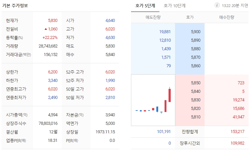 28일 오후 1시33분 기준 LS네트웍스 는 전 거래일 대비 1040원(21.80%) 오른 5810원에 거래 중입니다. 일봉 차트의 모습은 현재 단기·중기 이평선이 정배열 상태로 상승세를 보이고 있습니다.