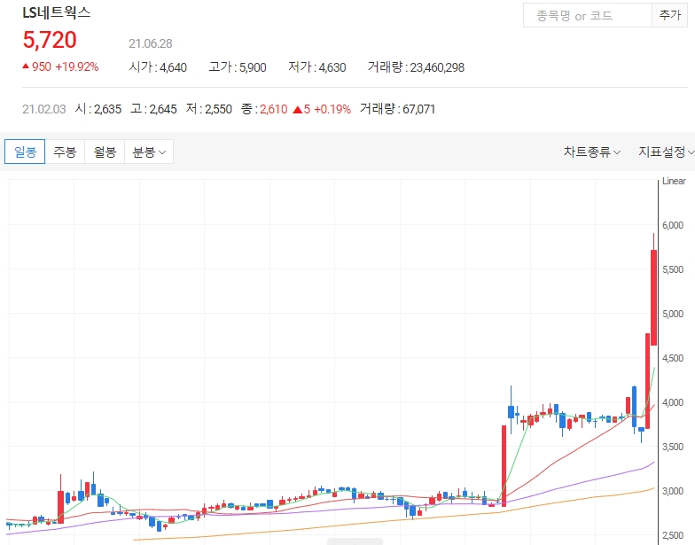 28일 오후 1시33분 기준 LS네트웍스 는 전 거래일 대비 1040원(21.80%) 오른 5810원에 거래 중입니다. 일봉 차트의 모습은 현재 단기·중기 이평선이 정배열 상태로 상승세를 보이고 있습니다.