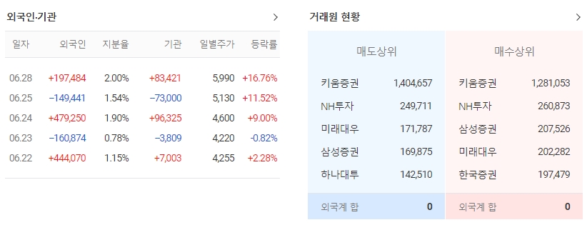 지난 한달을 기준으로 보면 외국인이 58.4만주를 순매수했고, 개인들도 58.3만주를 순매수했습니다. 하지만 기관은 53.9만주를 순매도했습니다. 같은 기간 개인의 거래비중이 90.7%로 가장 높아, 주요 거래 주체로 참여했음을 알 수 있습니다.