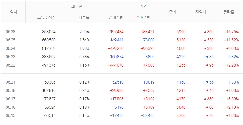 지난 한달을 기준으로 보면 외국인이 58.4만주를 순매수했고, 개인들도 58.3만주를 순매수했습니다. 하지만 기관은 53.9만주를 순매도했습니다. 같은 기간 개인의 거래비중이 90.7%로 가장 높아, 주요 거래 주체로 참여했음을 알 수 있습니다.